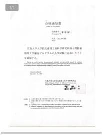 Good news to start the new year!Pujie Ma, a graduate of the 2023 undergraduate program in Safety Engineering at our university, has been accepted as a master's student in the Advanced Science and Engineering Department at Hiroshima University in Japan.Hiroshima University is a top-tier comprehensive national university situated in Higashima City, Hiroshima Prefecture, Japan.It has garnered global attention for its scientific research achievements, produced numerous renowned researchers, and enjoys a strong international reputation.