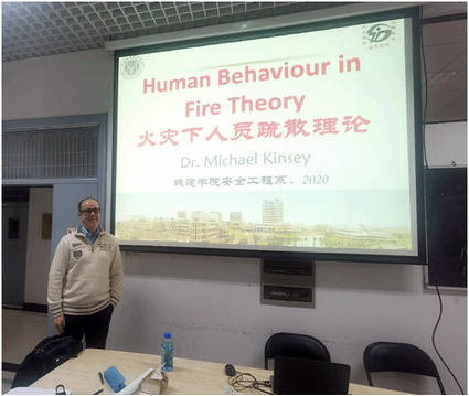 Dr. Michael Kinsey在讲座中主要围绕人群在火场中采取疏散行动的关键动机、在建筑设计阶段,火灾中人们采取行动的高水平目标、人们在火灾时作决策的理论框架、人们在火灾情况下展示出来的基本行为、疏散过程中的等待心理以及在历史火灾案例中发现典型的人类行为学特征,共6个方面展开演讲。此次讲座,通过各种行为学和心理学的基础理论,帮助学生认识火场逃生的复杂性,为后期引入的建模仿真技术奠定基础。
