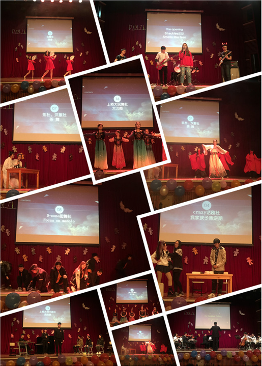 首先上场的Shackles乐队,作为晚会的开场,劲爆的英文歌曲,以及架子鼓和吉他选手激情的表演,点燃了整个会场的气氛。接着伴随宛转悠扬的歌声响起,由民舞社所带来的舞蹈“咏春”吸引了众人的目光,只见红裙配折扇的舞者随着歌声舞动旋转。礼仪社所带来的“冲上云霄的礼仪”,以首次乘坐飞机的情景为背景缓缓展开,展示了飞机上的礼仪。话剧社“我家孩子的叛逆期”,父母与孩子之间的对话,在令观众感受到幽默风趣的同时,又不失教育意义。圈角匡动漫社、魔鬼口才社、逸清茶社、棣棠汉服社、D-zone街舞社、设计与展示设、器乐社、相声社、音乐社分别带来自己的特色表演,将晚会推向了又一个高潮。