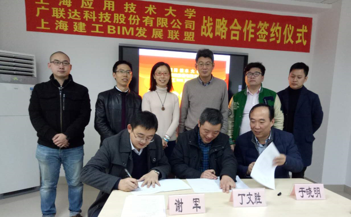 12月26日,城市建设与安全工程学院与上海建工BIM发展联盟、广联达科技股份有限公司三方共同成立了“BIM应用技术发展联盟”并签署战略合作协议,标志着BIM协同创新平台迈向新的发展阶段。上海建工集团BIM研究所所长于晓明、广联达教育培训事业部副总经理谢军、校规划与学科建设办公室处长房永征,城建学院院长丁文胜等人员出席。