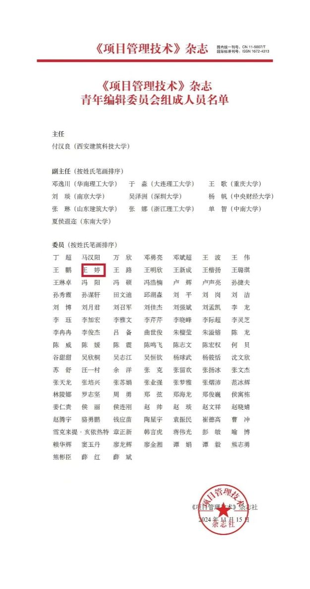 近日,王婷老师受聘成为《项目管理技术》青年编委。《项目管理技术》杂志青年编委自招募以来,得到了高校、科研院所、企业等机构的青年学者的积极响应,报名申请总数260位。经过初选、复选等流程,最终拟选出125名青年编委(含1名主任,10名副主任,114名委员)。