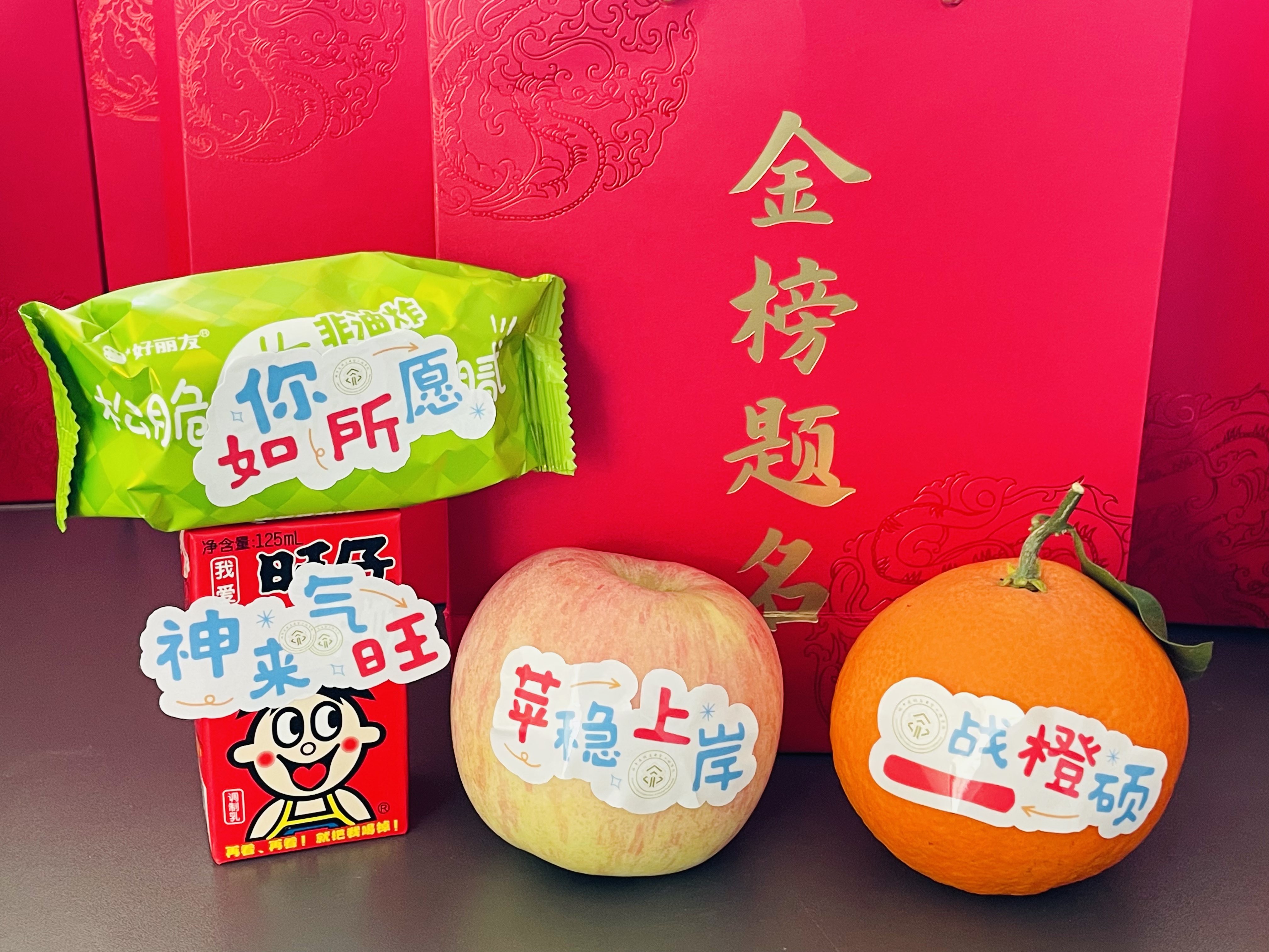 城建学院团委、学生会为此次活动精心挑选和制作了慰问品。包括:“金榜题名”手提袋,“如你所愿”薯愿、“神来气旺”牛奶、“苹稳上岸”苹果和“一站橙硕”冰糖橙,每件礼物都贴上了学生亲手设计的城建学院祝福语。丁文胜详细介绍了每一份慰问品的寓意,希望这些小礼物能为同学们的考研之路增添一份力量和信心。
