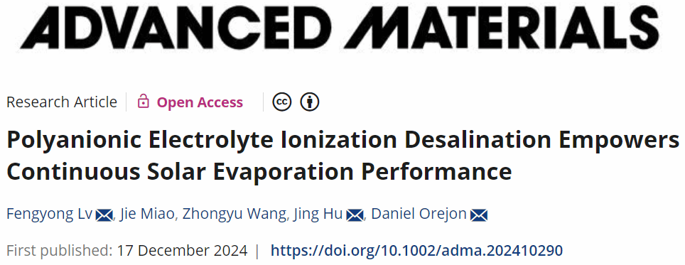 近日,城建学院吕凤勇副教授课题组在《Advanced Materials(IF=27.4是一本备受瞩目的材料科学领域国际顶级期刊)上在线发表题为“Polyanionic Electrolyte Ionization Desalination Empowers Continuous Solar Evaporation Performance”的研究成果,该研究论文是以上海应用技术大学为第一单位,该研究针对太阳能蒸发器在实际海水淡化过程中盐晶体析出问题,利用聚阴离子电解质功能化策略,实现优异的均匀脱盐性能,证明了聚阴离子电解质功能化作为排盐策略对高性能太阳能海水淡化技术和其他技术的发展具有卓越的益处。吕凤勇副教授为论文第一作者、研究生苗洁、王忠禹、胡静教授和爱丁堡大学Daniel Orejon老师作为本文通讯作者。(https://doi.org/10.1002/adma.202410290)