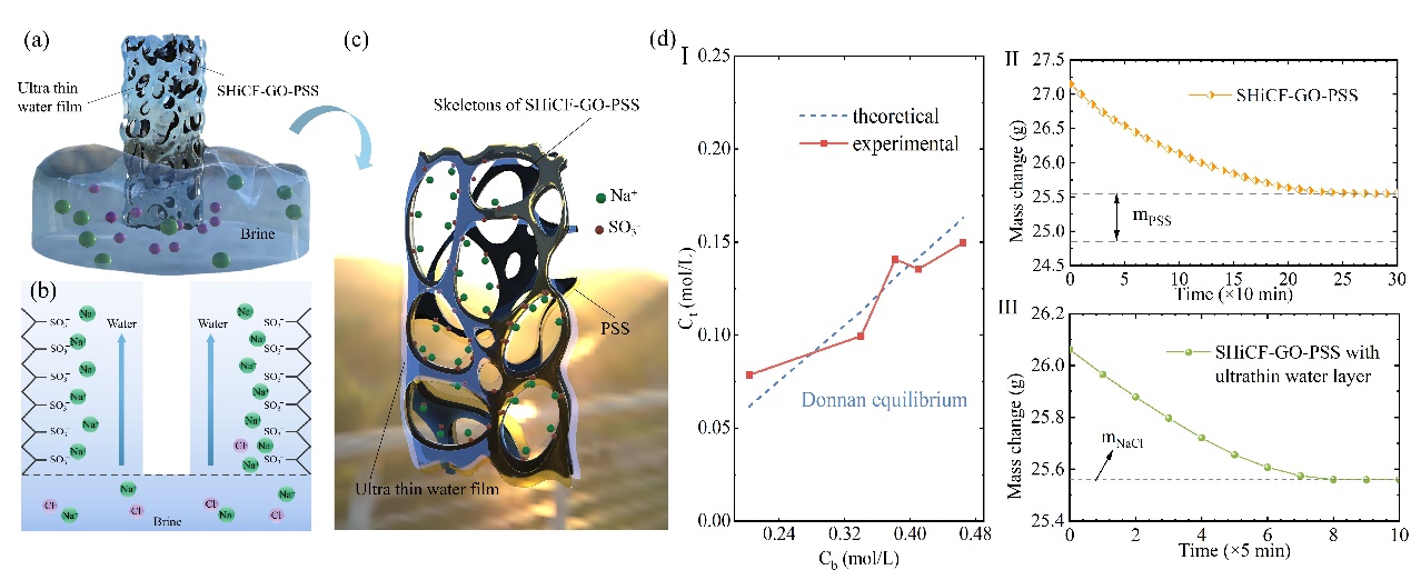针对太阳能蒸发器在实际海水淡化过程中盐结晶问题,部分研究采用额外的物理方法除盐,或通过调控盐结晶区域对蒸发器性能的影响,但长期海水淡化性能依然较差。本研究巧妙地通过在SHiCF-GO倒圆锥蒸发器骨架表面沉积聚阴离子聚电解质,利用Donnan平衡从水运路径抑制主体水中盐离子向蒸发界面的输运,避免在海水淡化过程中的盐结晶。通过系统的实验,验证了其在模拟海水,实际海水以及户外条件下的蒸发排盐稳定性。为简单、经济地实现海水淡化并在其过程中保持蒸发性能的稳定提供了一种新思路。