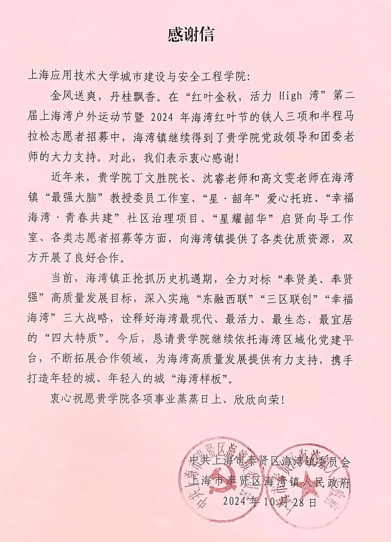近日,城建学院收到一封来自奉贤区海湾镇人民政府的感谢信。一路走来,历经风雨,城建学院与奉贤区海湾镇的合作始终朝着更加美好的未来迈进。期待与海湾镇人民政府继续拓展合作领域,加强沟通与联系,共同打造充满活力与年轻气息的“海湾样板”。