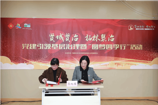活动在鼓乐迎宾的音乐中拉开序幕。奉贤区柘林镇海韵社区党支部书记沈磊对海韵社区的基本情况进行了详细的介绍。随后,沈磊与张小懿作为双方单位代表签订了党建共建协议,并共同参加了“三联五共·融合治理”项目的启动仪式。