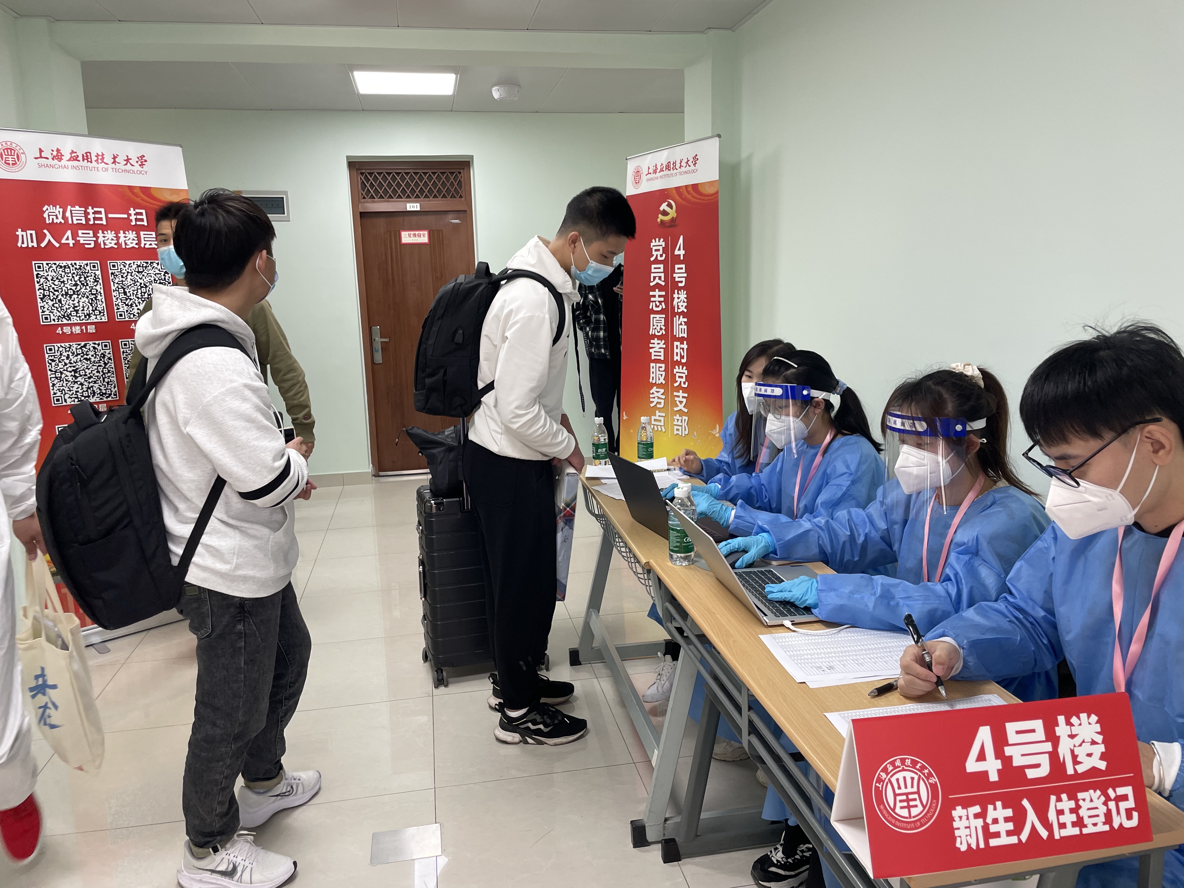 金秋的阳光温馨恬静,金秋的微风和煦轻柔。在这温馨的阳光照耀下,在这和煦的微风吹拂下,又到了上海应用技术大学一年一度的迎新之际。2022年10月24日,我校迎来了来自全国各地的莘莘学子。在校党委、学工部的统一指导下,4号楼临时党支部在4号楼学生公寓组织开展了迎新志愿活动。志愿者们遵从相关防疫要求,正确穿戴防护服、口罩、面罩,秉持着“安全、热情、友好、规范”的工作要求和积极的服务态度,开启了一天的迎新志愿工作。