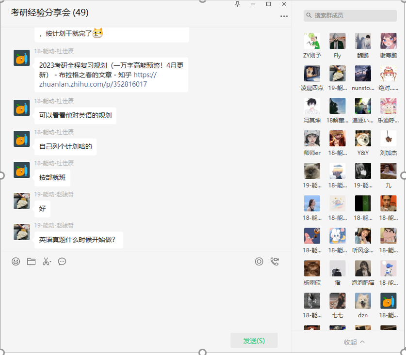 随后,考取华东理工大学的解董军、卢肖,考取上海理工大学的黄冬梅、杜佳辰,考取中国科学技术大学的彭惜墨等共计17名同学从自身考研经历出发,围绕专业和院校选择、复习计划制定、心态调整、时间安排、复试注意事项、调剂等方面谈了自己的亲身体验和感受。紧接着,在主持人的有效组织下,19级学生有序就院校选择、学科复习、心理调适等考研方面所面临的困惑向学长们进行针对的提问和请教,18级学长们或结合自己的亲身经历,或以身边研友正反两方面的典型经验,或实实在在地推荐自律和学习“神器”,一一为学弟学妹们答疑解惑,并希望他们能坚定学业目标,戒骄戒躁,努力拼搏,力争考入自己理想的院校。