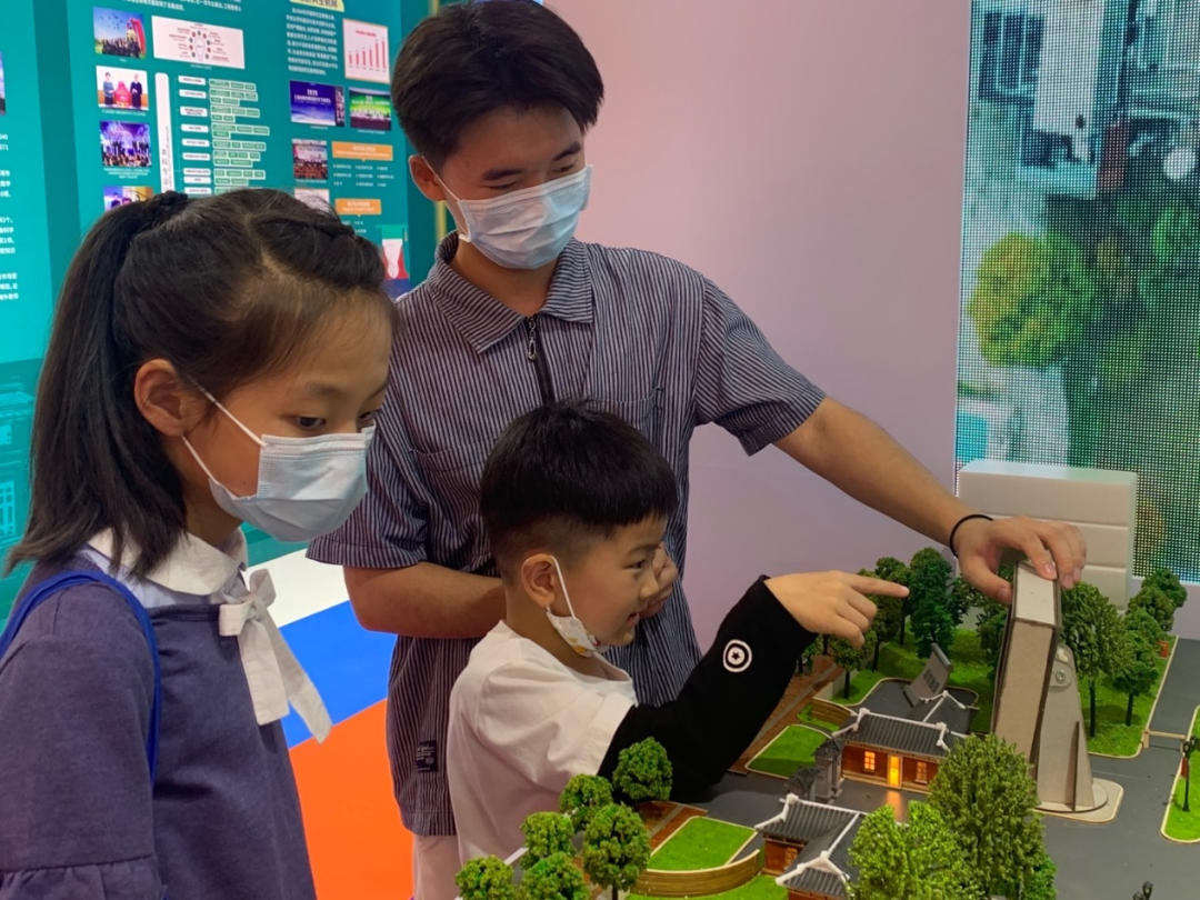 校友带孩子参观模型并与同学合影