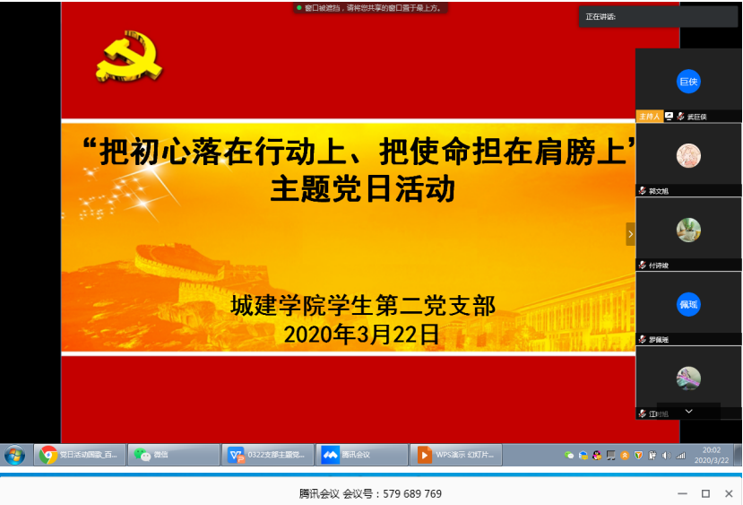 3月22日城建学院学生第二党支部以“把初心落在行动上、把使命担在肩膀上”为主题开展线上主题党日活动。支部全体党员参加会议,会议由支部书记武巨侠主持。
