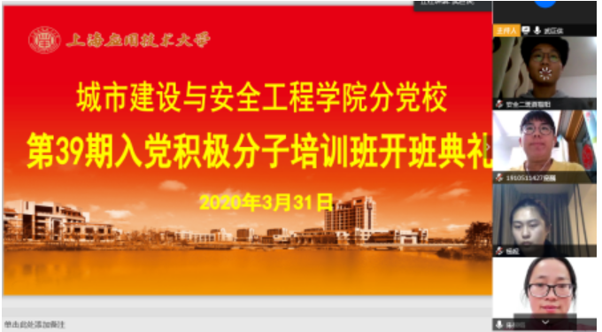3月31日,城建学院分党校通过“腾讯会议”平台在线上举行第39期入党积极分子培训班开班典礼。城建学院党总支书记朱柳娟、学生党支部书记、辅导员及本期62位学员参加典礼。典礼由党总支副书记、副院长张小懿主持。