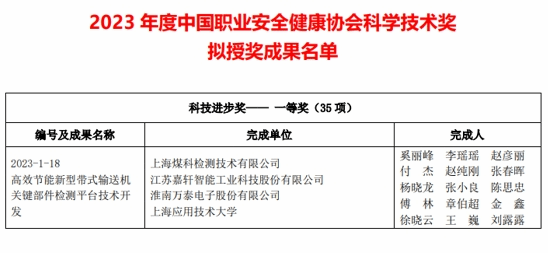 2023年12月25日,中国职业安全健康协会公布了2023年度中国职业安全健康协会科学技术奖获奖名单。由城建学院安全工程创新团队党支部教师张小良、赵彦丽主要参与的“高效节能新型带式输送机关键部件检测平台技术开发”项目荣获2023年度中国职业安全健康协会科技进步奖一等奖。