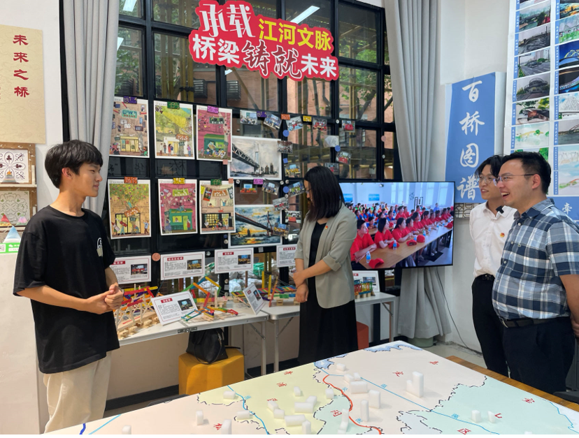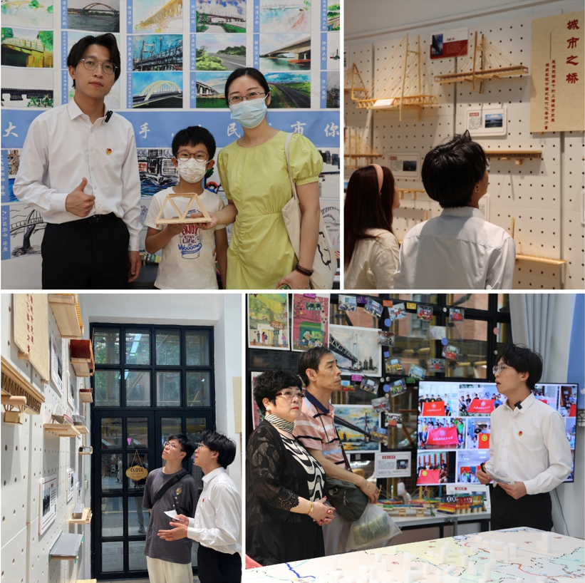 2023年8月24日,由上海应用技术大学城市建设与安全工程学院桥起城华团队与上海市黄浦区瑞金二路街道联合举办的“承载江河文脉,桥梁铸就未来”主题展览在黄浦区南昌路296号盛大开幕。上海应用技术大学城市建设与安全工程学院党委书记朱柳娟,黄浦区瑞金二路街道党工委副书记、办事处主任姚炜等与大学生们共话江河文化。
