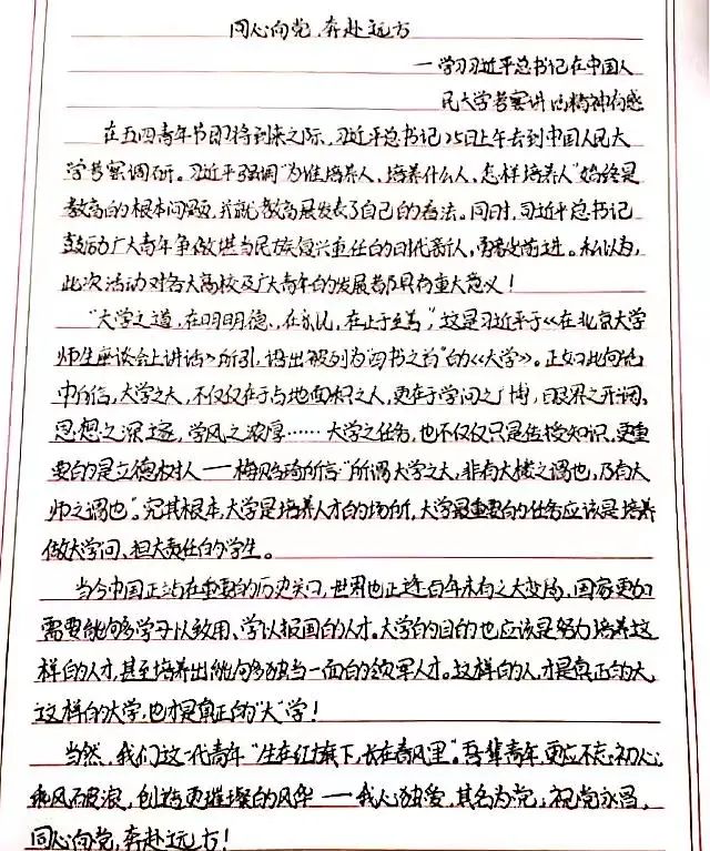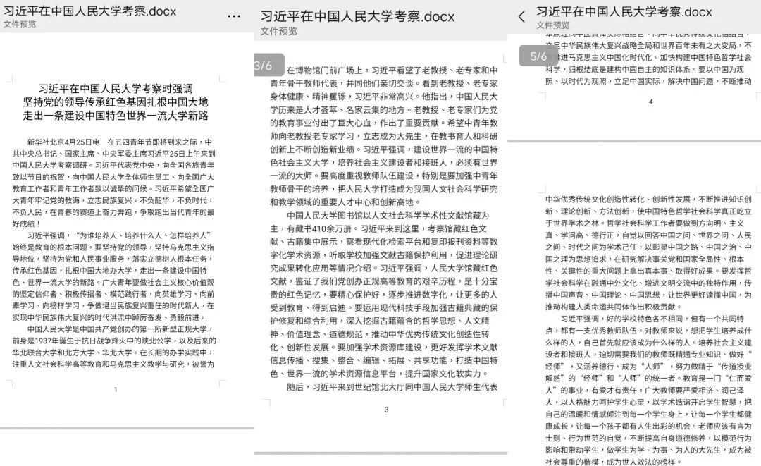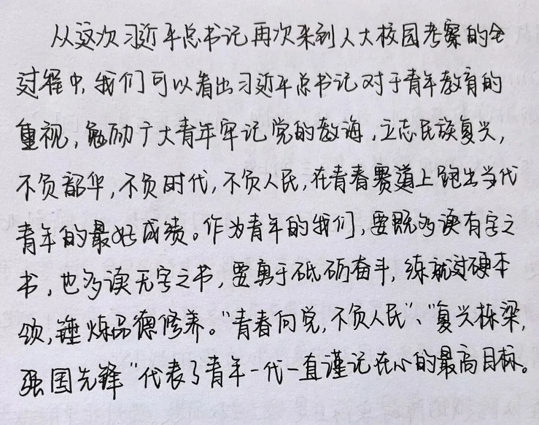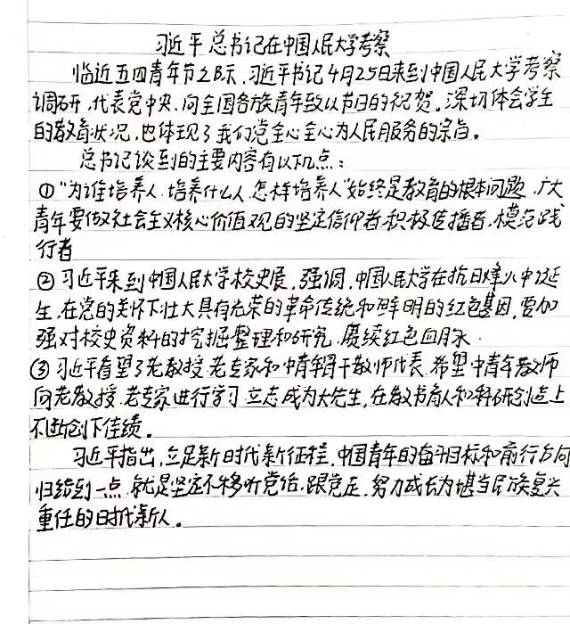 今天学习了本群里分享的学习链接。主要讲了4月25日早,习近平主席访问中国人民大学的总过程。在五四青年节前夕,与教师同学们进行访谈中,习近平强调,“为谁培养人、培养什么人、怎样培养人”始终是教育的根本问题。走遍校园环境,访问师生员工,令我印象深刻的是,当习近平看到老教工身体健康,精神抖擞时,脸上的欣喜神情,可见习近平对民众的关怀备至。