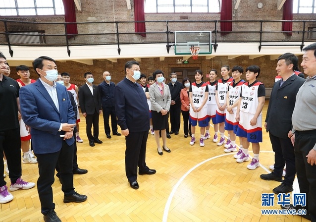 ▲4月19日,在清华大学建校110周年校庆日即将来临之际,中共中央总书记、国家主席、中央军委主席习近平来到清华大学考察。这是习近平在清华大学西体育馆篮球场同校篮球运动员亲切交谈。新华社记者 鞠鹏 摄