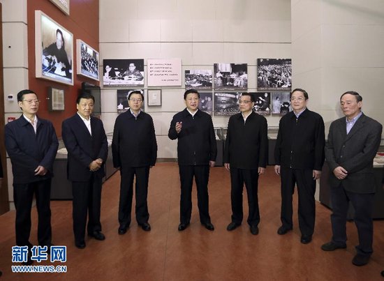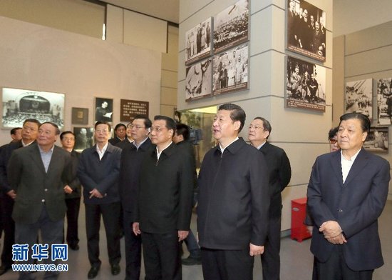11月29日,中共中央总书记、中央军委主席习近平和中央政治局常委李克强、张德江、俞正声、刘云山、王岐山、张高丽等来到国家博物馆(微博),参观《复兴之路》展览。新华社记者 兰红光 摄