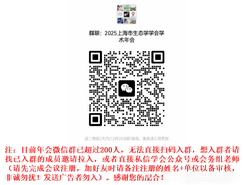 *有意参加口头报告和墙报展示者,请于2025年12月23日前将墙报及论文摘要(摘要格式:2025年上海市生态学学会学术年会摘要提交格式.docx)发送至会议邮箱zhaokun@sit.edu.cn,邮件标题统一格式为题目+作者姓名+工作单位+联系方式。会议详细安排见第三轮会议通知。